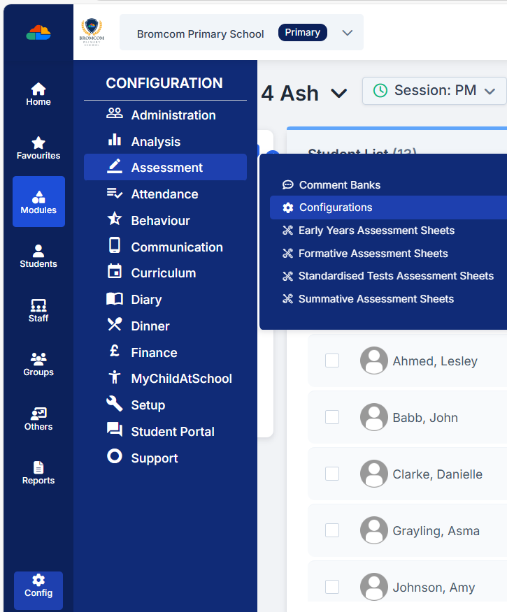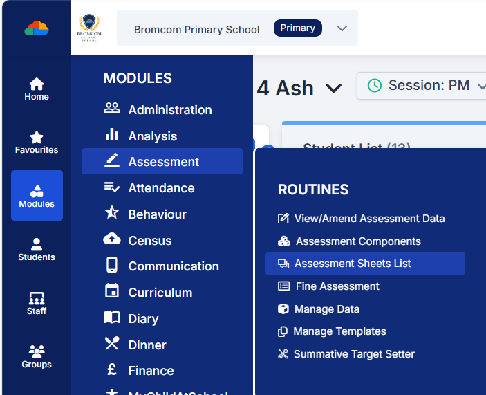 From the Menu on the left go to Modules >Assessment > Assessment Sheets List