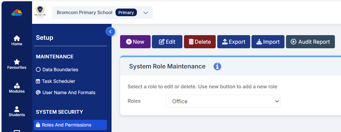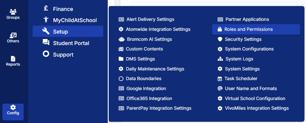 To set Permissions for access to the Assessment Sheets List where the Stage Assessment Sheets are located, from the left hand menu go to Config then Set Up and Role and Permissions.