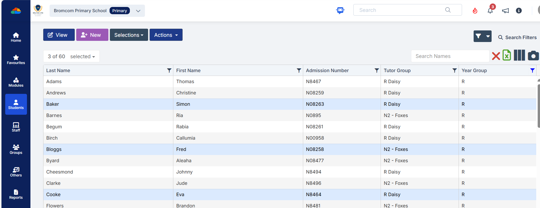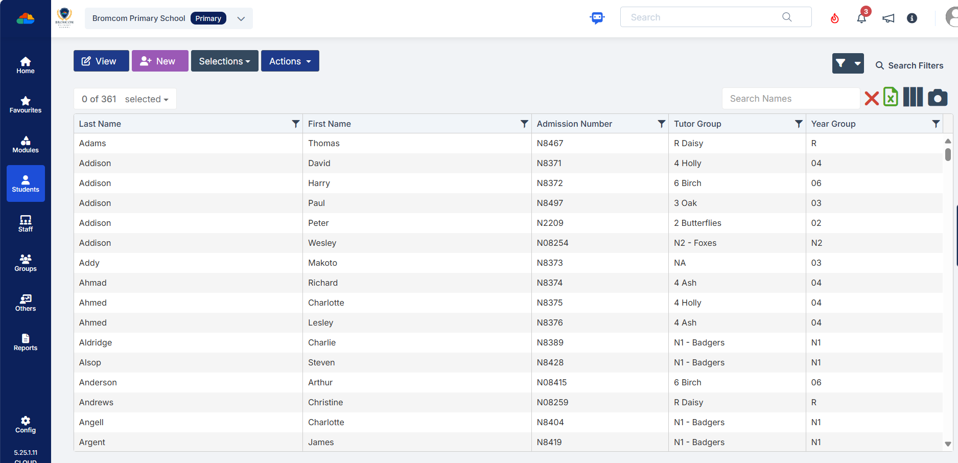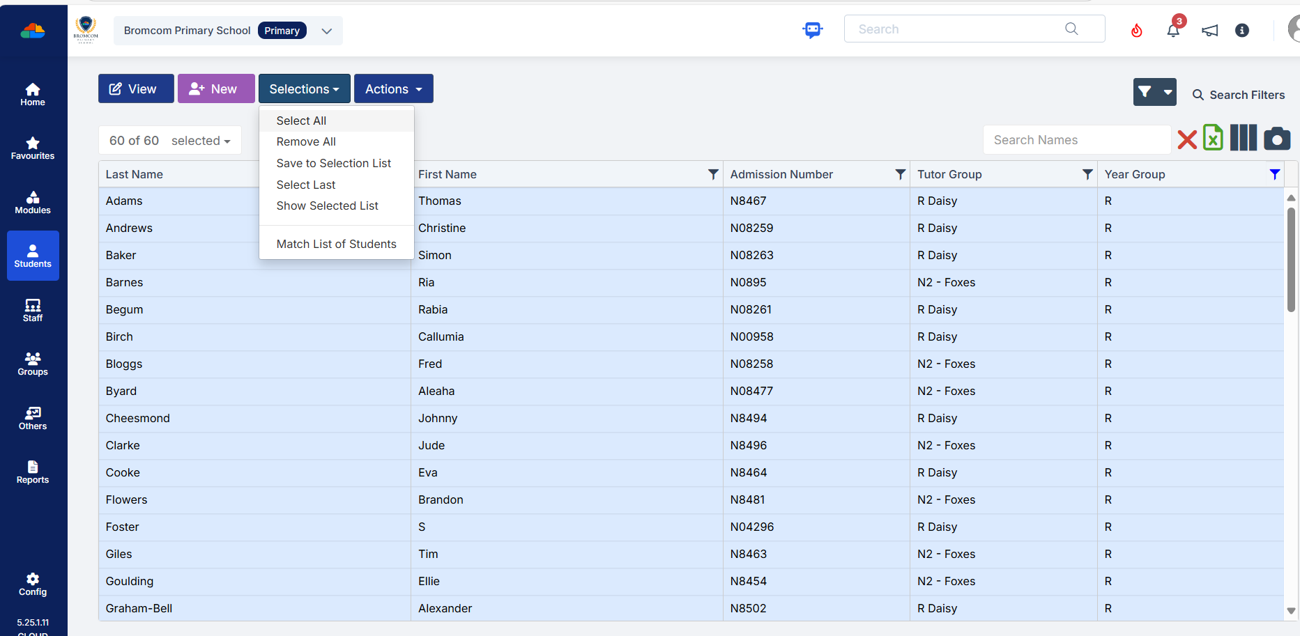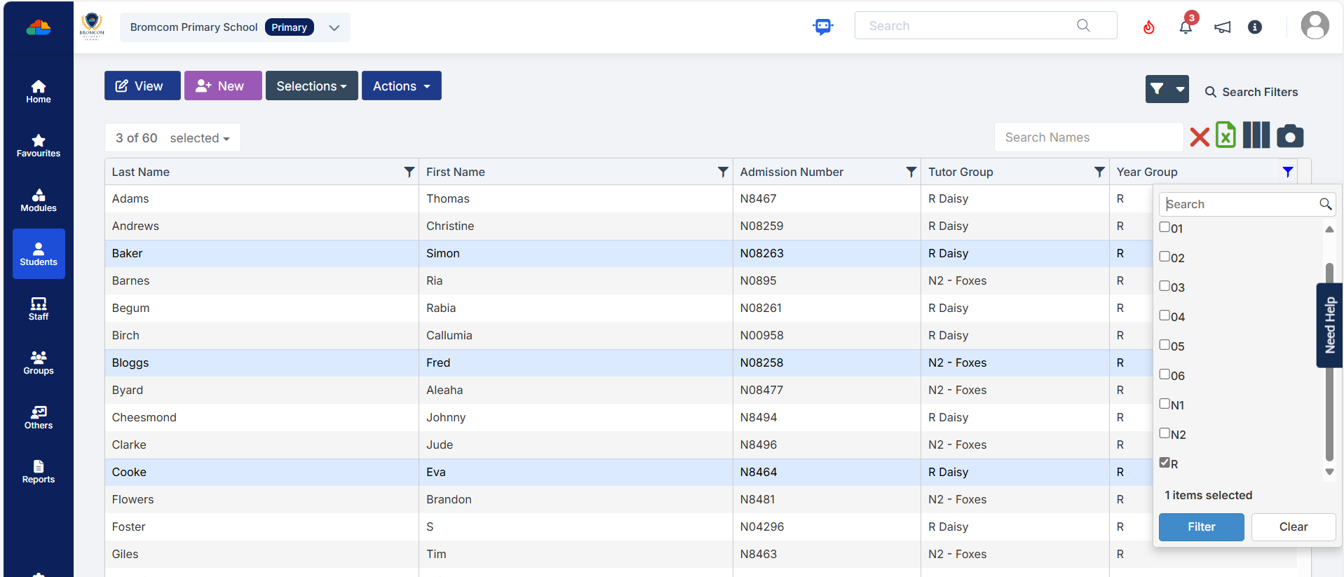Select by Groups: to filter the list by a specific Year Group click on the 3 vertical blue bars to Add/Remove Additional Columns. Tick Year Group and Save to add it as a column to the Student List Page. Now you can filter by this Group.