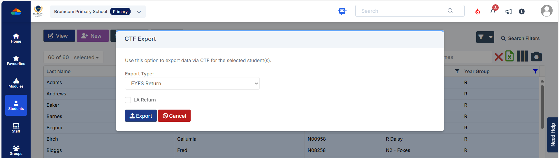 Select individual Students: Select the Students that you are producing an EYFS CTF for by clicking on each individual Student record; or