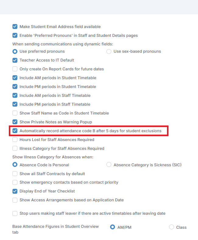 In the tick boxes on the right you’ll see an option that says Automatically record attendance code B after 5 days for student exclusions.