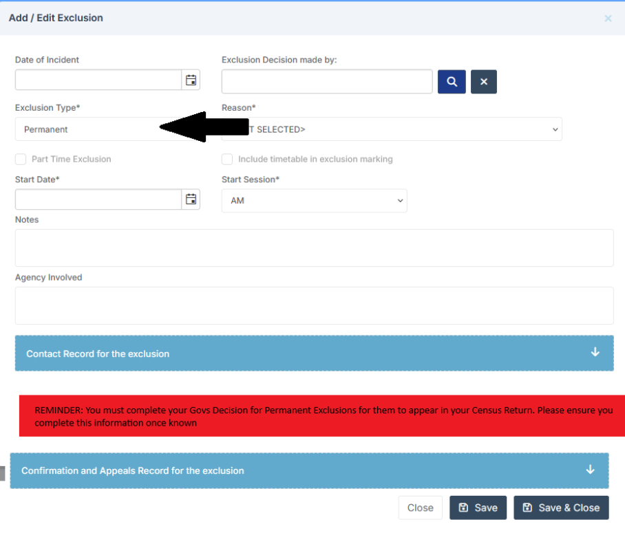 - Exclusion Type – What kind of Exclusion the Student is receiving, choose from Lunchtime, Permanent or Suspension