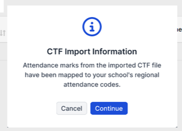If the Student has been imported either from an English School to a Welsh School or from a Welsh School to an English School, where the Attendance codes differ, they will be mapped to the equivalent Attendance Code in the region of the school that is importing the CTF. If this happens, you will see the following message, click Continue.