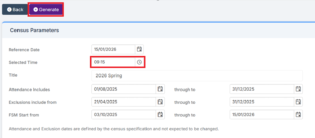 Enter the correct time in the Selected Time field (see below guidance on what Time to enter), ensure the rest of the information on the page is correct. Click Generate and continue to complete your Census as normal.