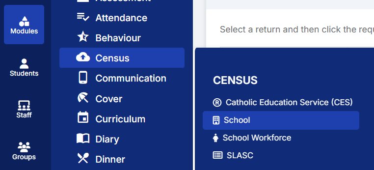 Once a Census return has been generated it is not possible to update the Selected Time, so it will be necessary to generate a new census return. To do this, go to Modules > Census > School.