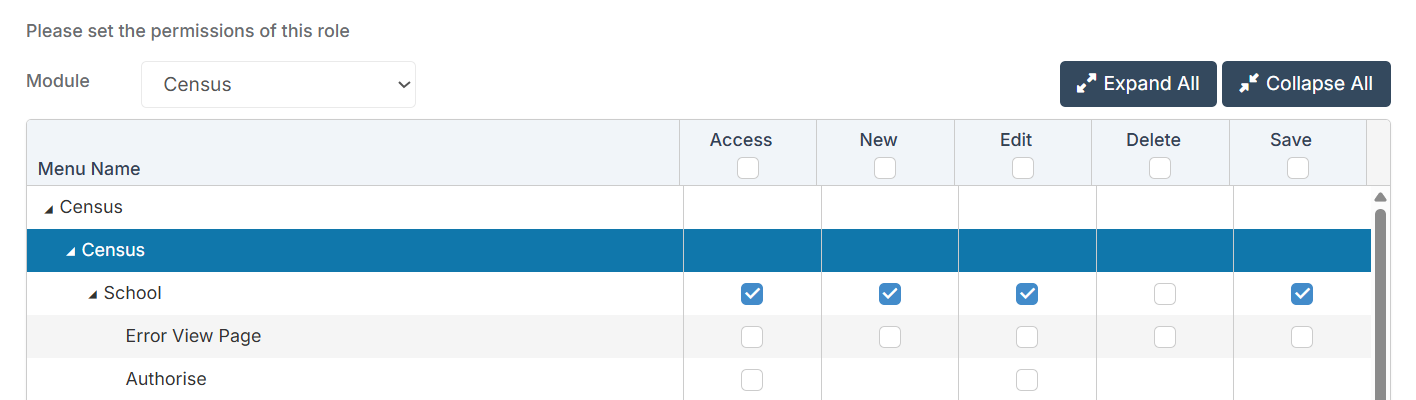 Permissions: The minimum permissions required to access the School Census can be found in the Census module from within Config > Setup > Roles & Permissions.