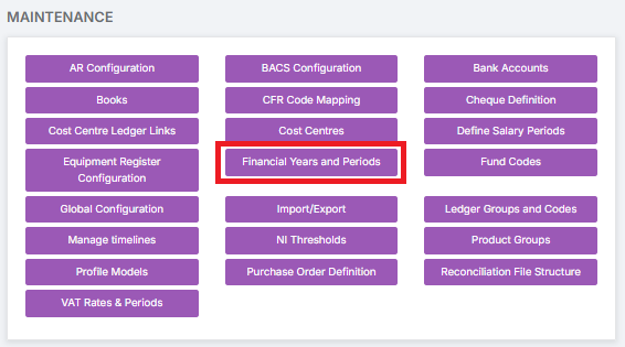 To begin, go to Modules > Finance > Finance Home Page > Maintenance > Financial Years and Periods.