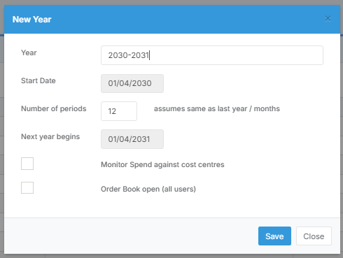 Enter the Year details, following the naming convention used for previous years. Check the Start Date and the Next year begins dates are correct. The system assumes that these will be the same day and month as the previous year. It is possible to Open the Order Book now, if required, by clicking the Order book open (all users) box. To complete the process click Save.