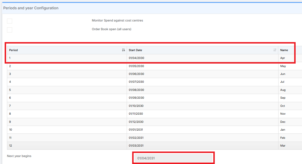 Click on the Newly Created Year and check the Start Date for each month is correct, and that the Next year begins on the correct start date.