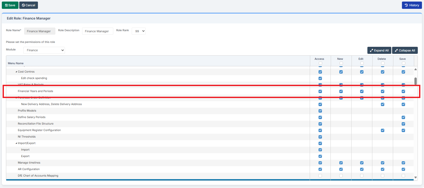 Access: The minimum permissions required to Create a New Financial Year are found in the Finance Module section Config > Setup > Roles & Permissions.