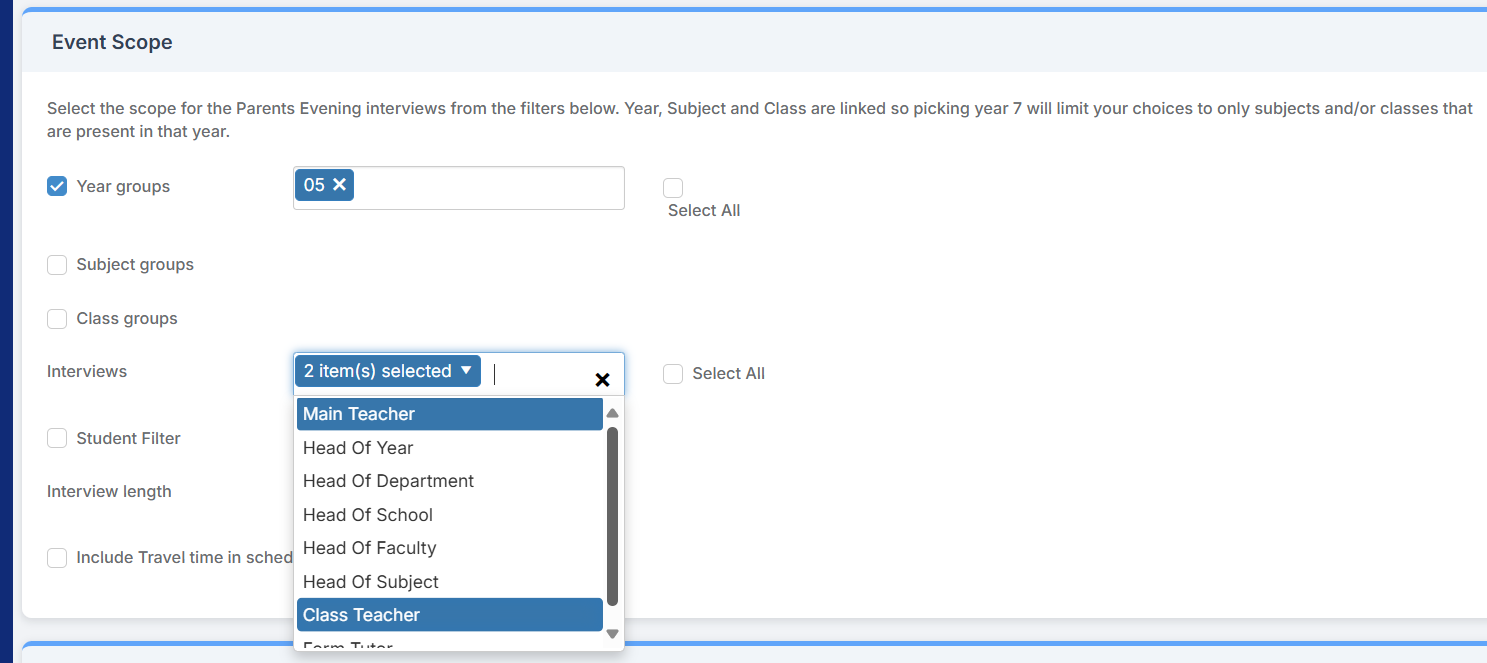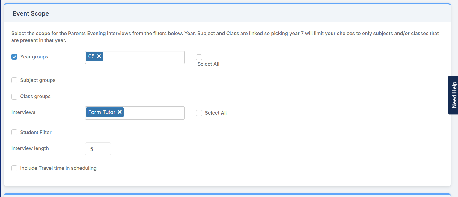 So in the example a Primary School has students taught in Tutor Groups and wants to set up a Year 5 Parents Evening then the Event Scope would look like the screenshot below.