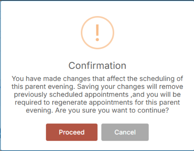 IMPORTANT : Please be aware that making changes to any part of a parents evening once it has gone live and parents have made bookings may cause existing bookings to be lost. The system will pop up the following warning and if proceeding it is irreversible.
