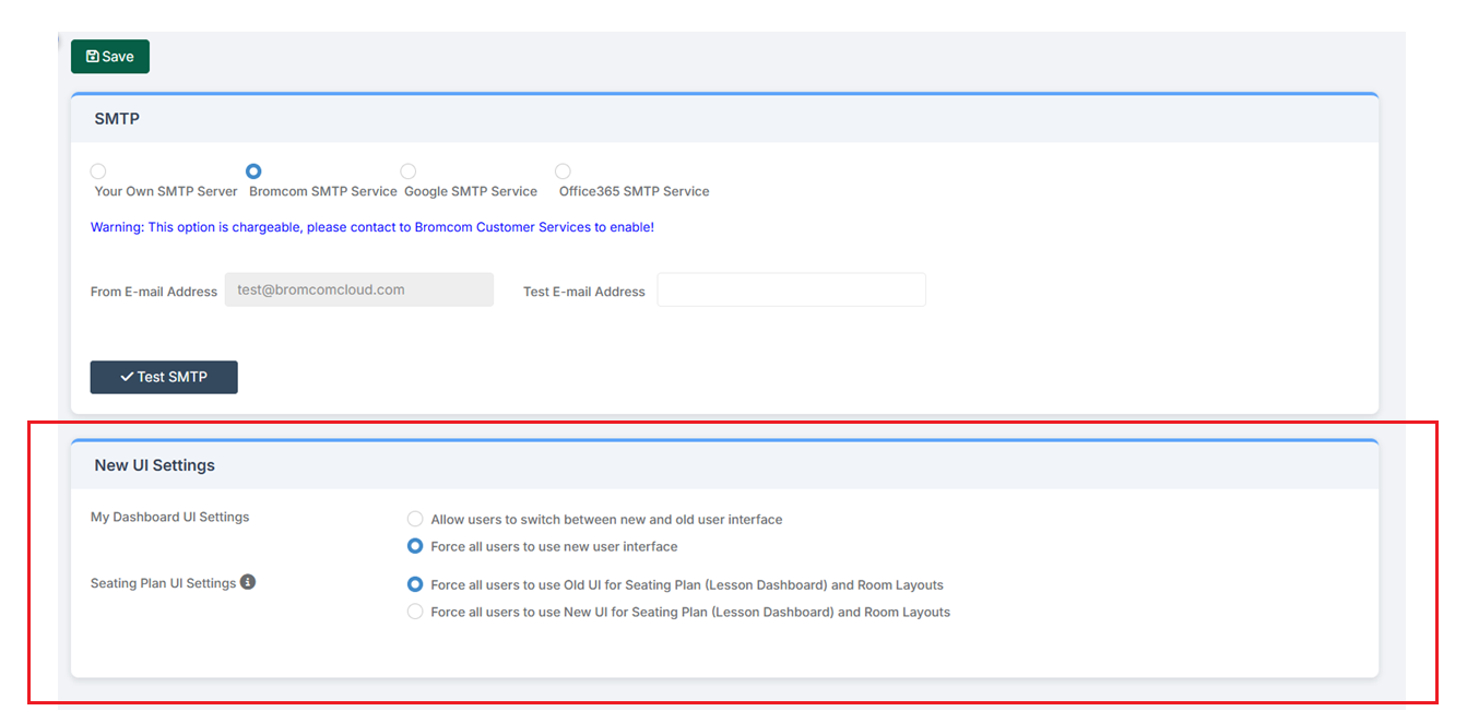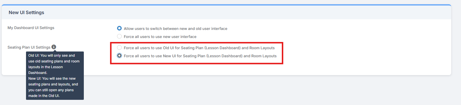 - If you select Old UI, the Lesson Dashboard will operate exclusively in the Old UI for seating plans and room layouts. You will only be able to view and use existing Old UI plans and layouts there, and you will not be able to access, create or use New UI seating plans or layouts from the Lesson Dashboard.