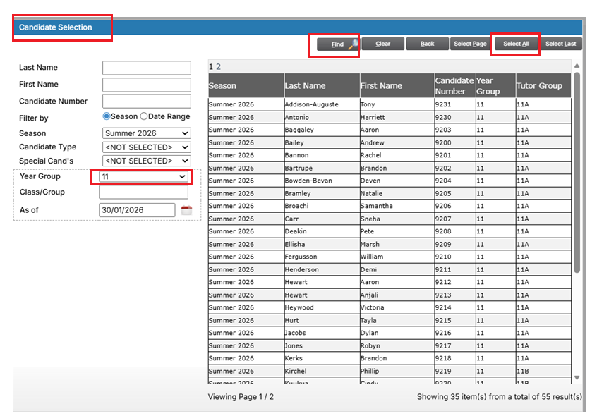In the example below we have selected 11 from the Year Group filter, click Select All once the required Candidates have been selected