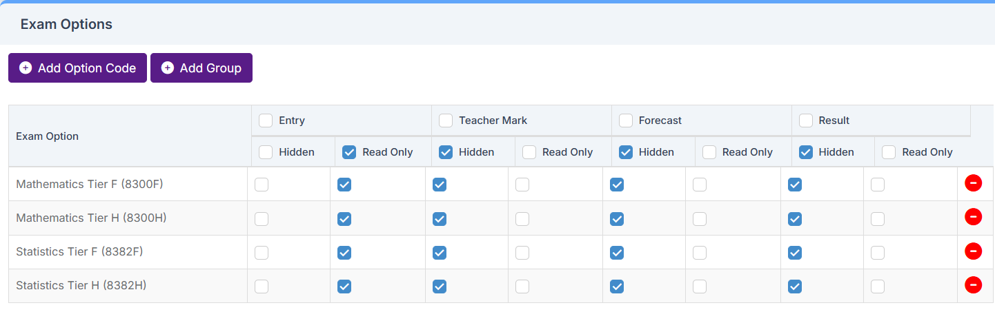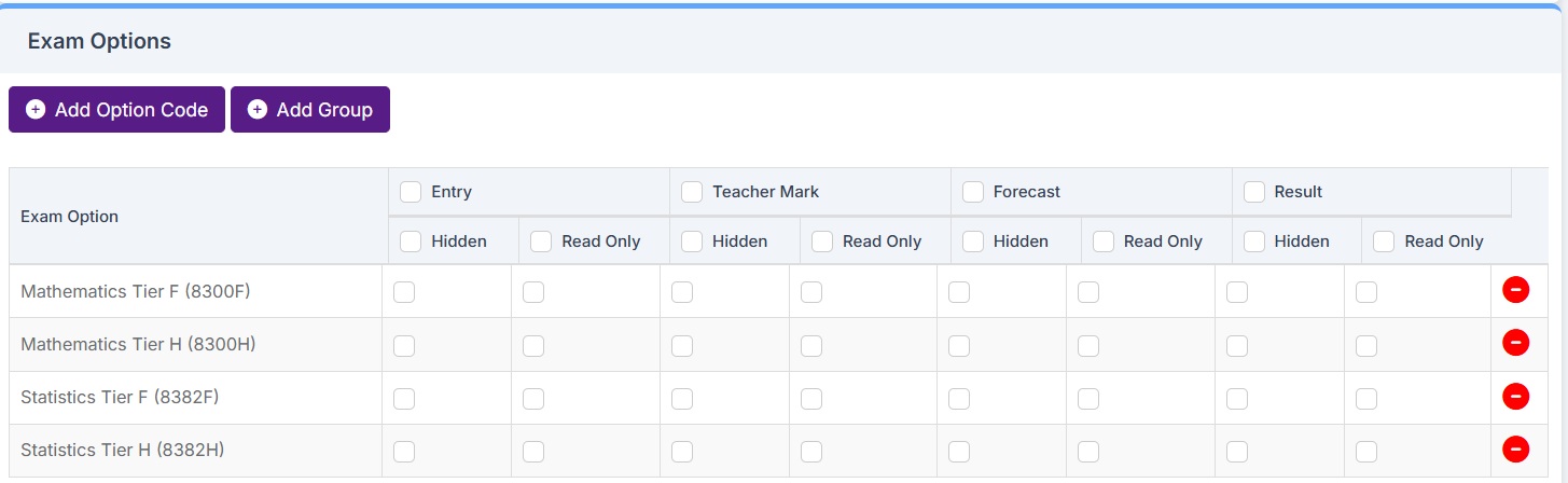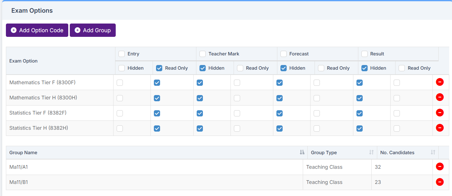 In this example 4 Option Codes have been chosen, this means we can enter a class for either Foundation or Higher GCSE Maths as well as Foundation or Higher GCSE Statistics if needed.