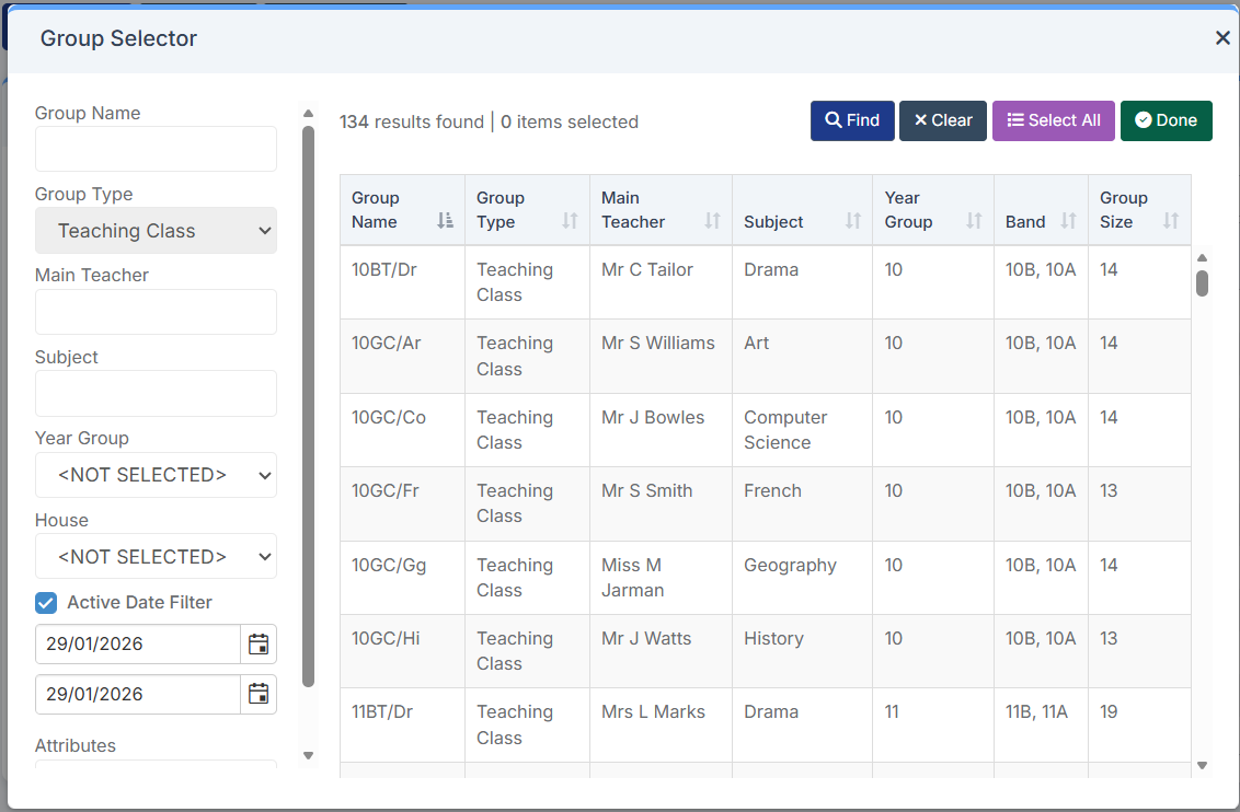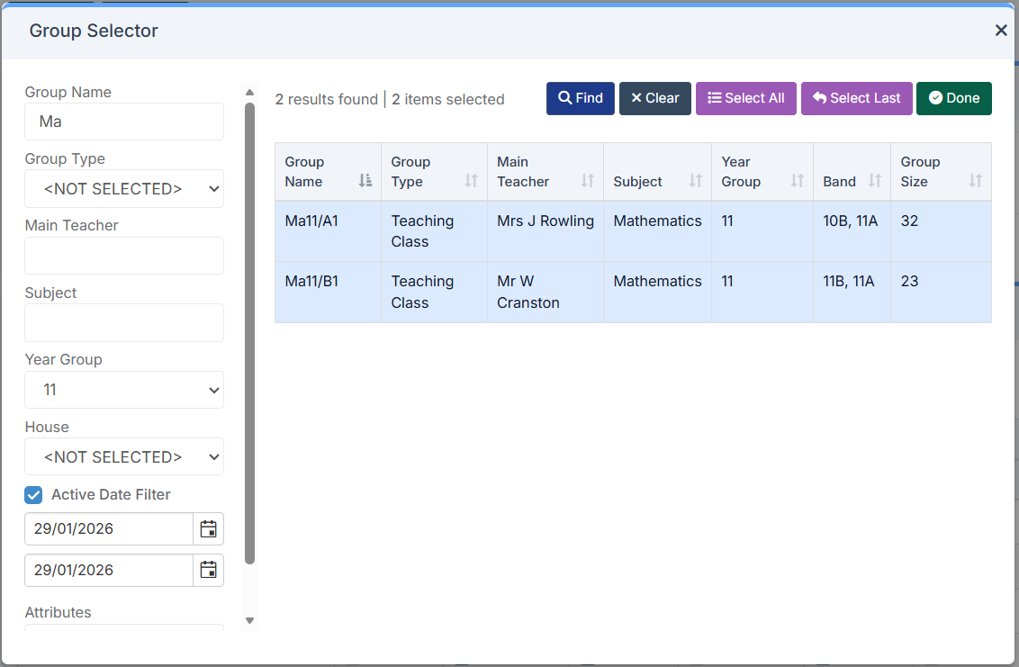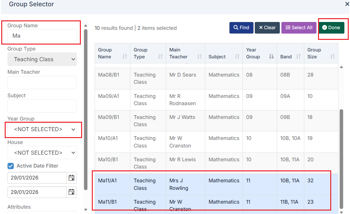 - In the example below Ma has been entered into the top left Group Name, Ma has been selected in this example as all the Maths Teaching Classes in this database begin with Ma.