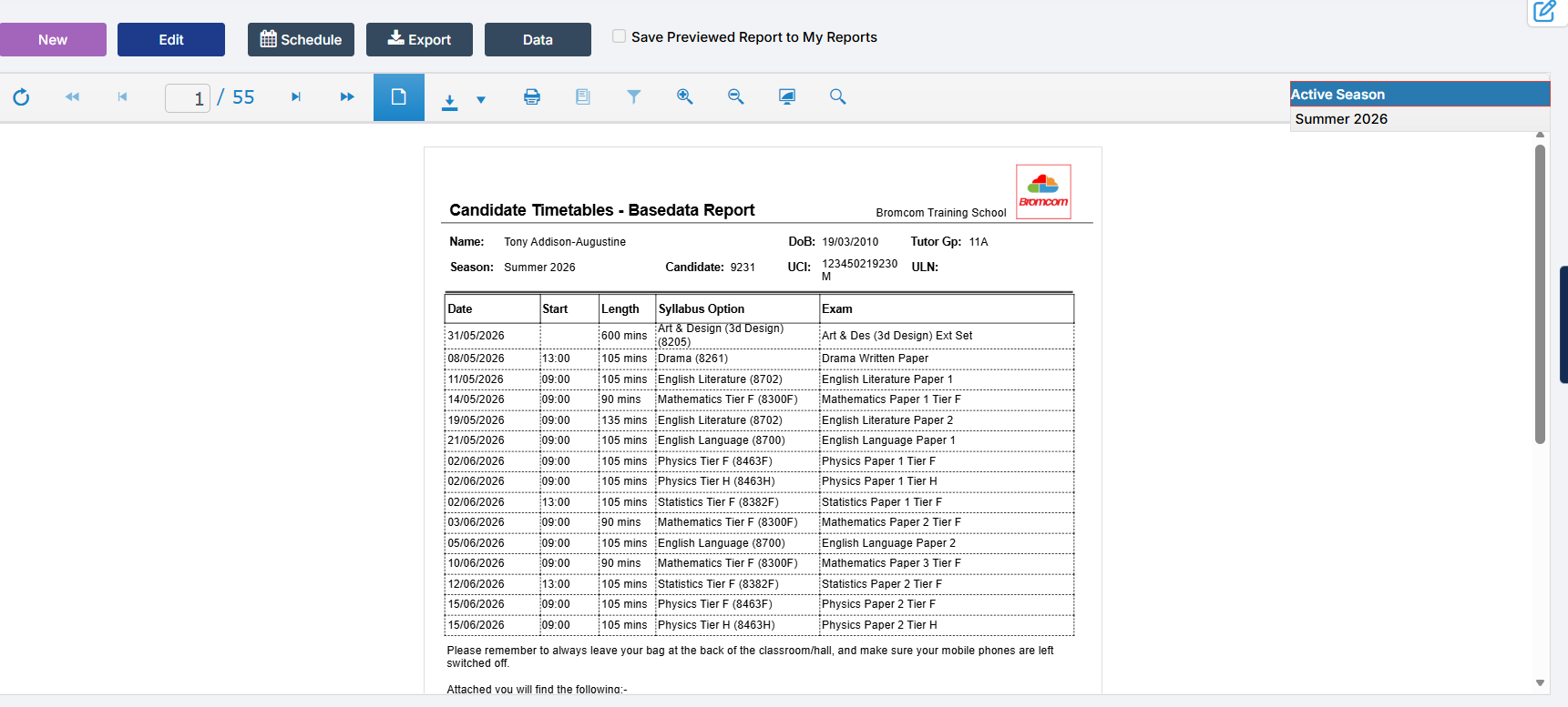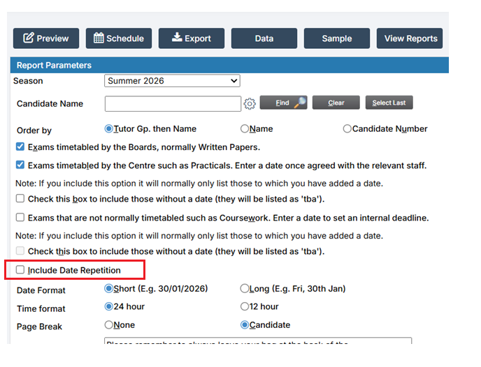 Tip: tick to Include Data Repetition so the Exam Date will show on every line in the Candidate Timetables Baseadata Report if required