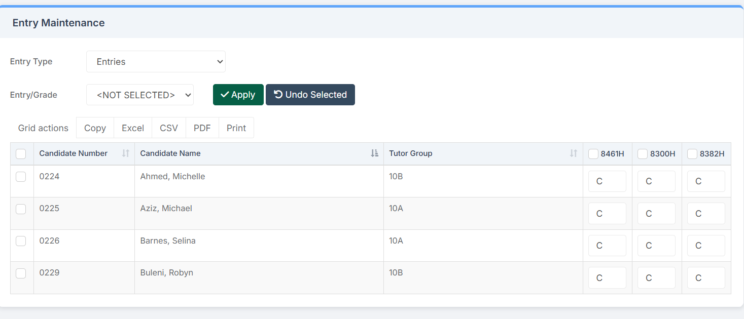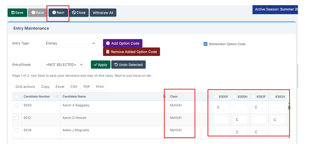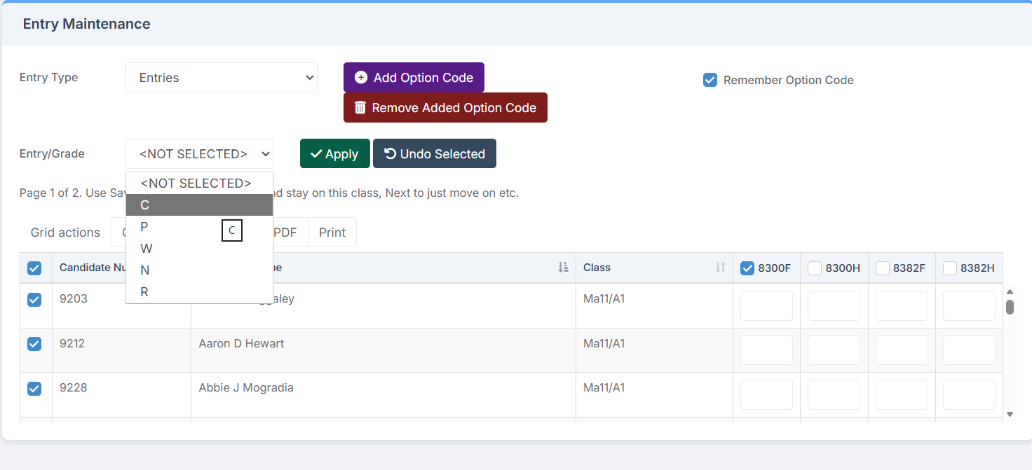 Or alternatively click to Select All Candidates in the left hand column tick, choose the required Entry Grade and Apply to enter all Candidates for all Option Codes.