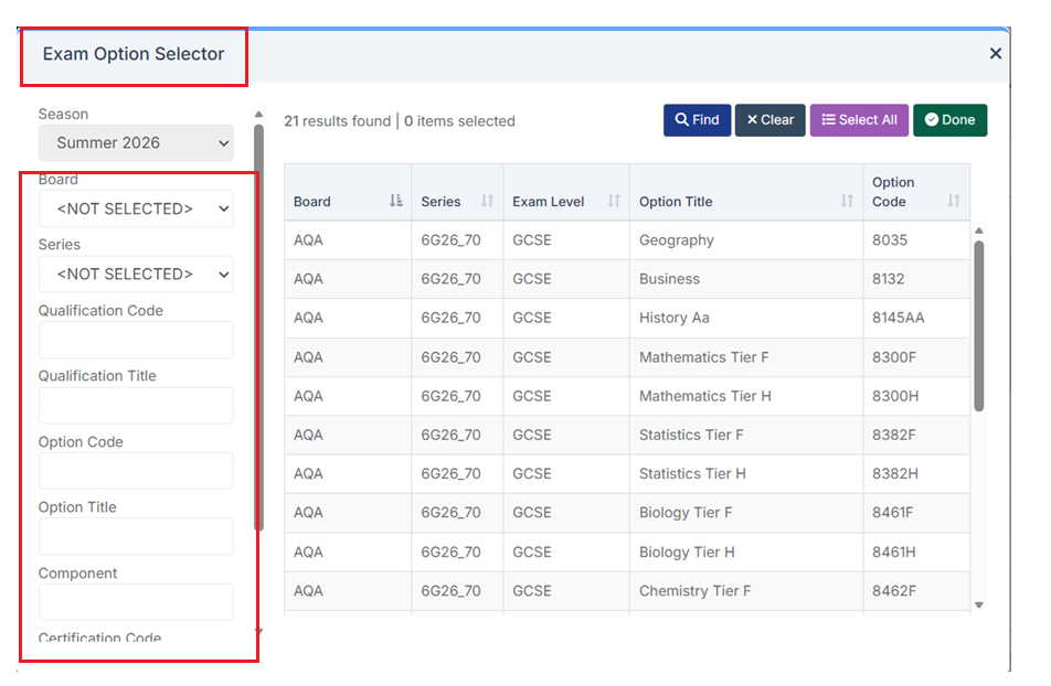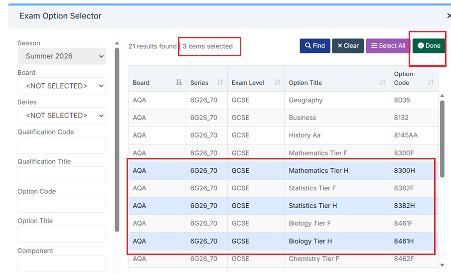 This will open the Exam Options Selector, use the filters on the left to refine your search, find the required Exam Options and click on each of them once to select them, once you have selected all required Exam Options, click Done.