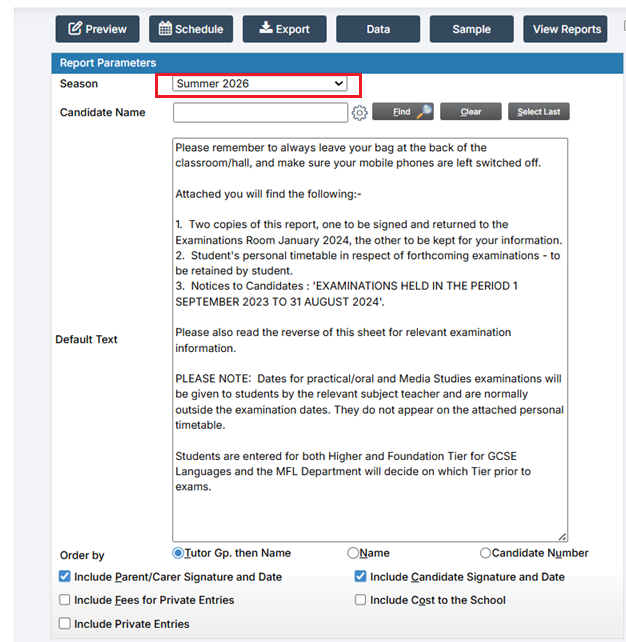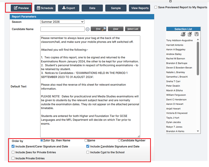 Choose to Order by Tutor Group then Name, Name or Candidate Number and if required tick/ untick as required in the Include boxes.