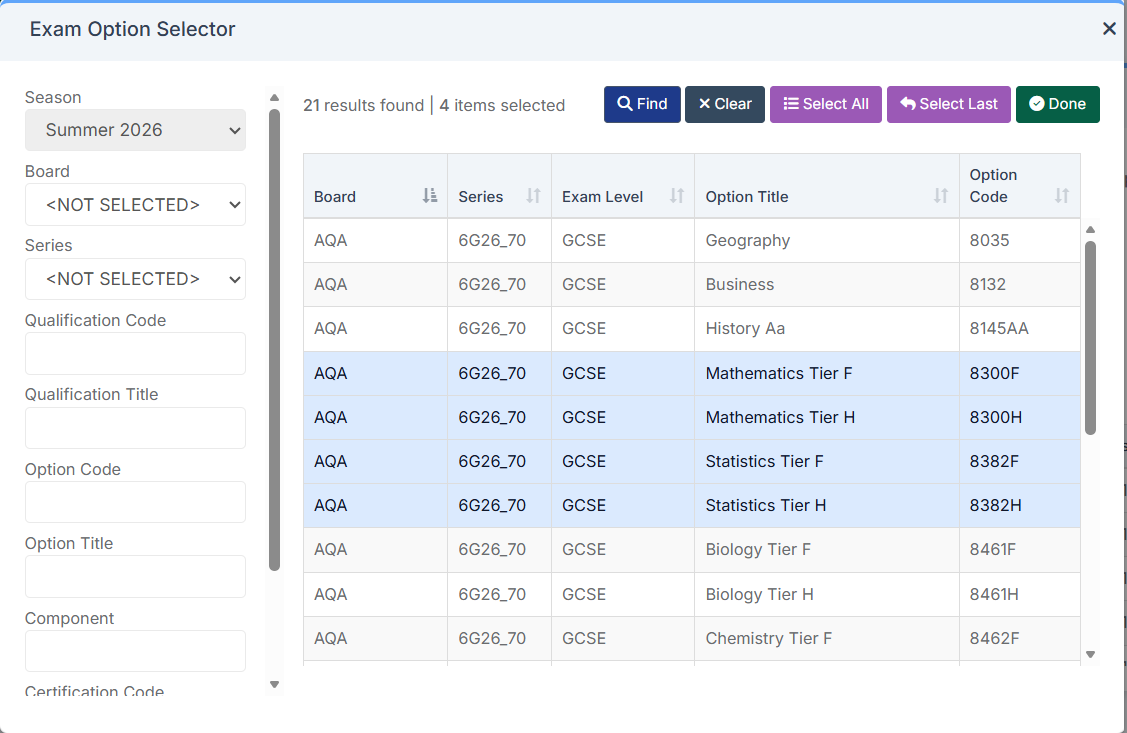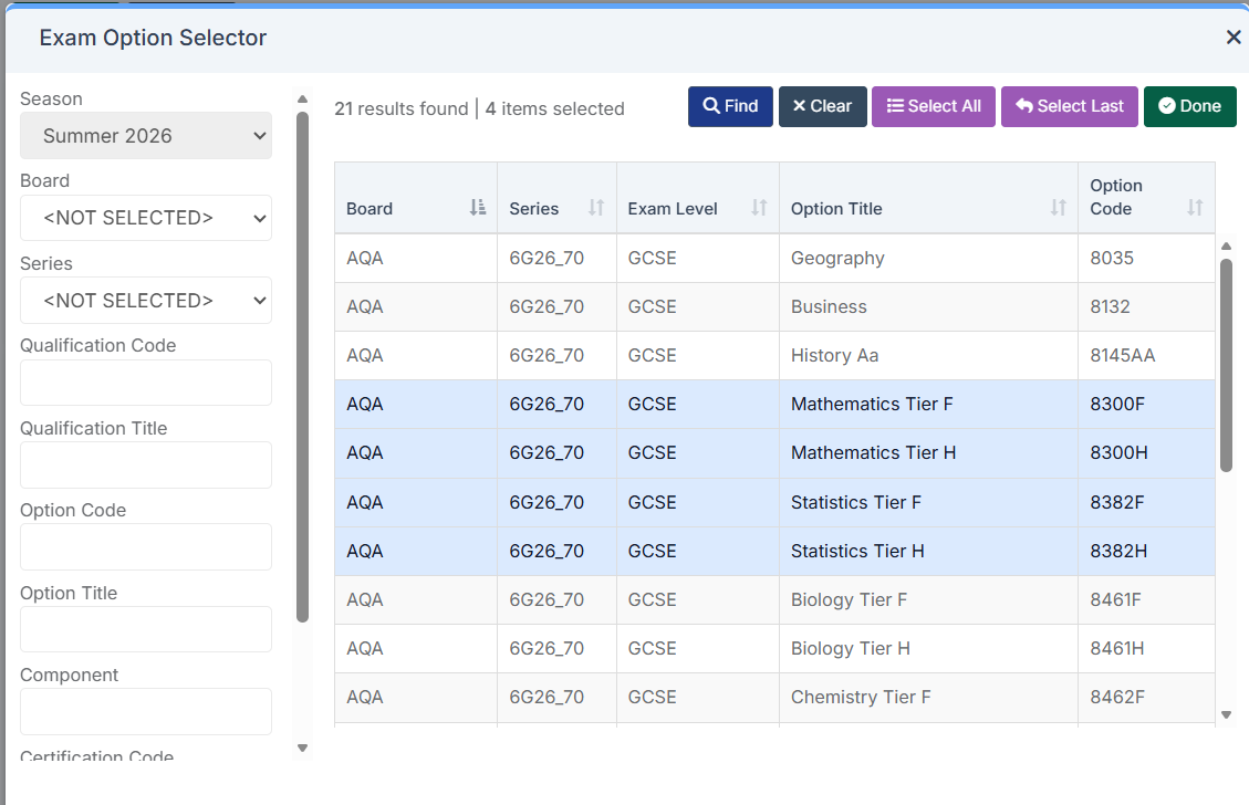 In the example below multiple Exam Option Codes have been selected for Maths 8300H, Statistics 8382H and Biology 8461H