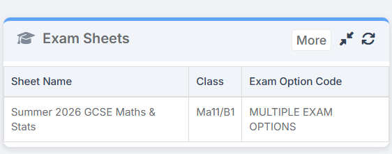 Click More in the widget to see all Exam Sheets, this can also be accessed via Modules>Examination>Exam Sheets List