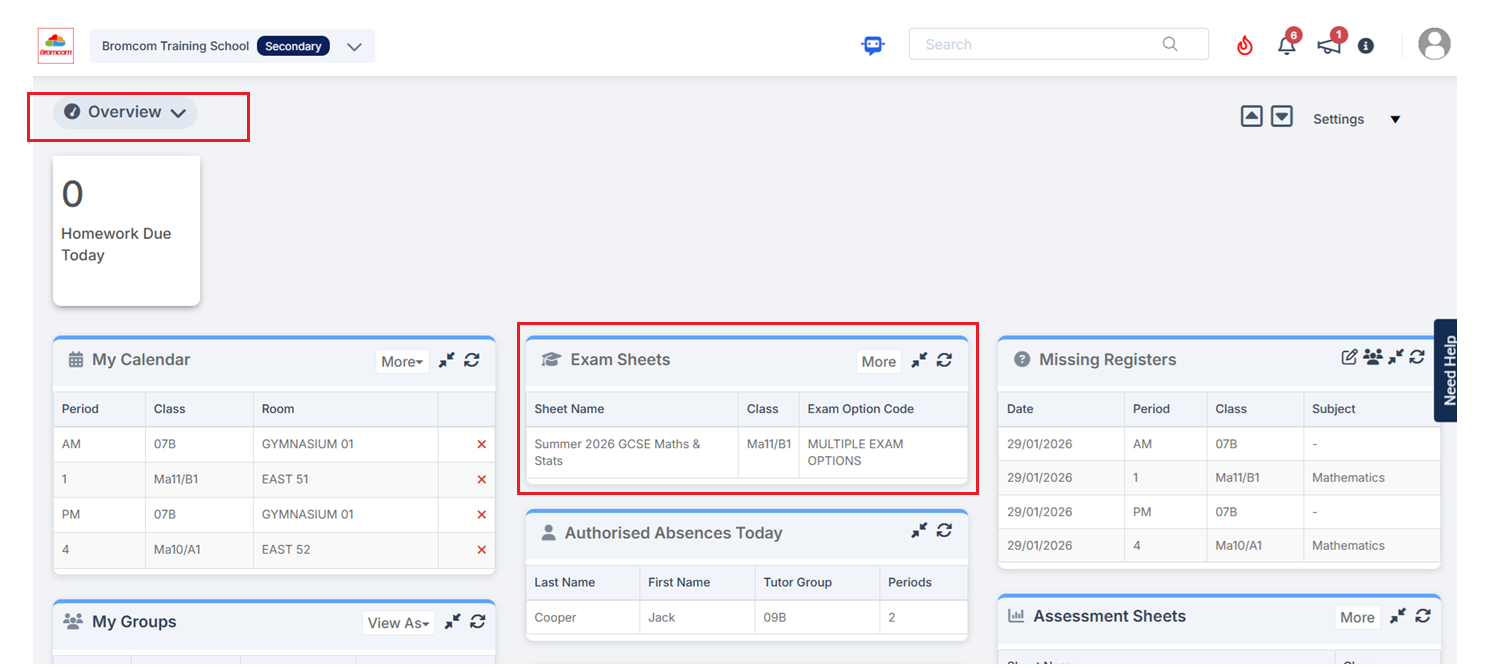 Note: The Exam Sheets will only be shown to those Teachers who are linked with the Group associated with the Exam Sheet, whether that is as a Class Teacher, Head of Department, Head of Year etc. For more information on how to add Staff to Groups please see How to Add Staff to Teaching Classes and/or Groups.
