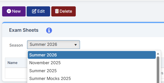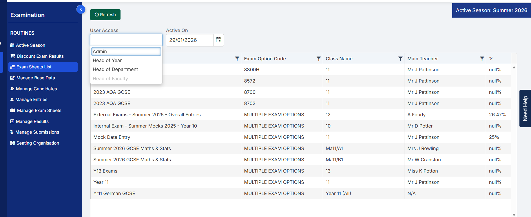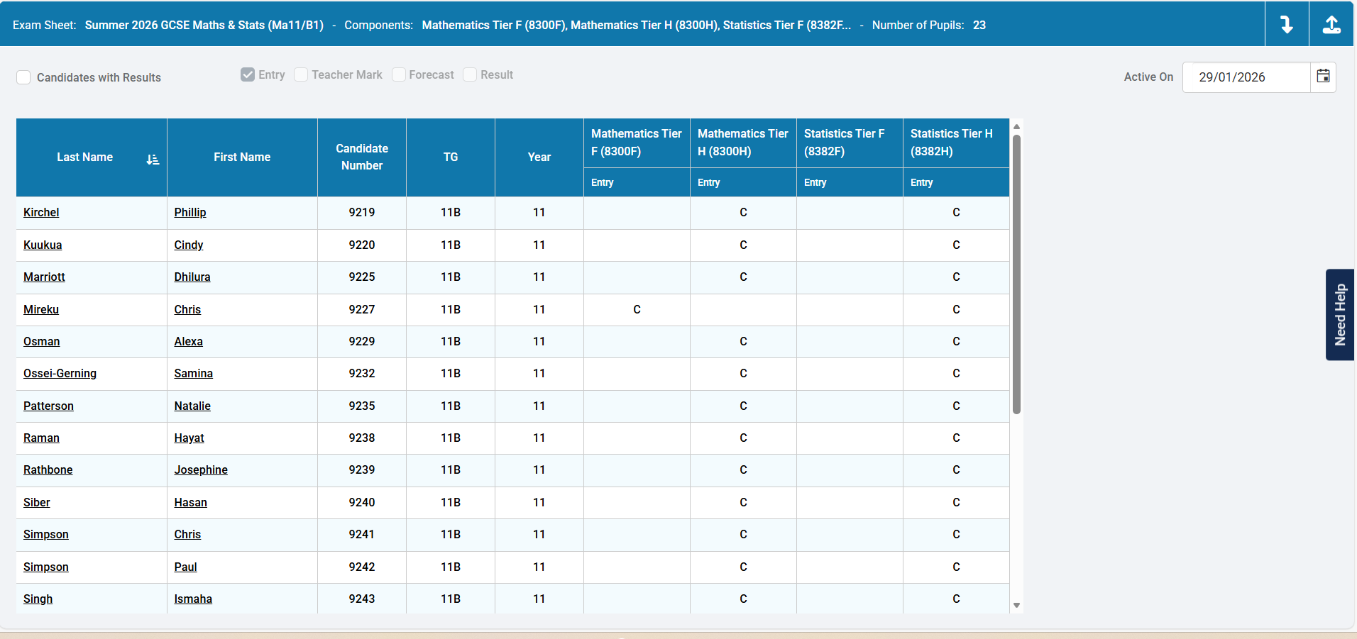 - Teachers use the Exam Sheets Lists to Enter/Edit Exam Entry Codes plus see Marks, Forecasts and Results for students in their Classes.