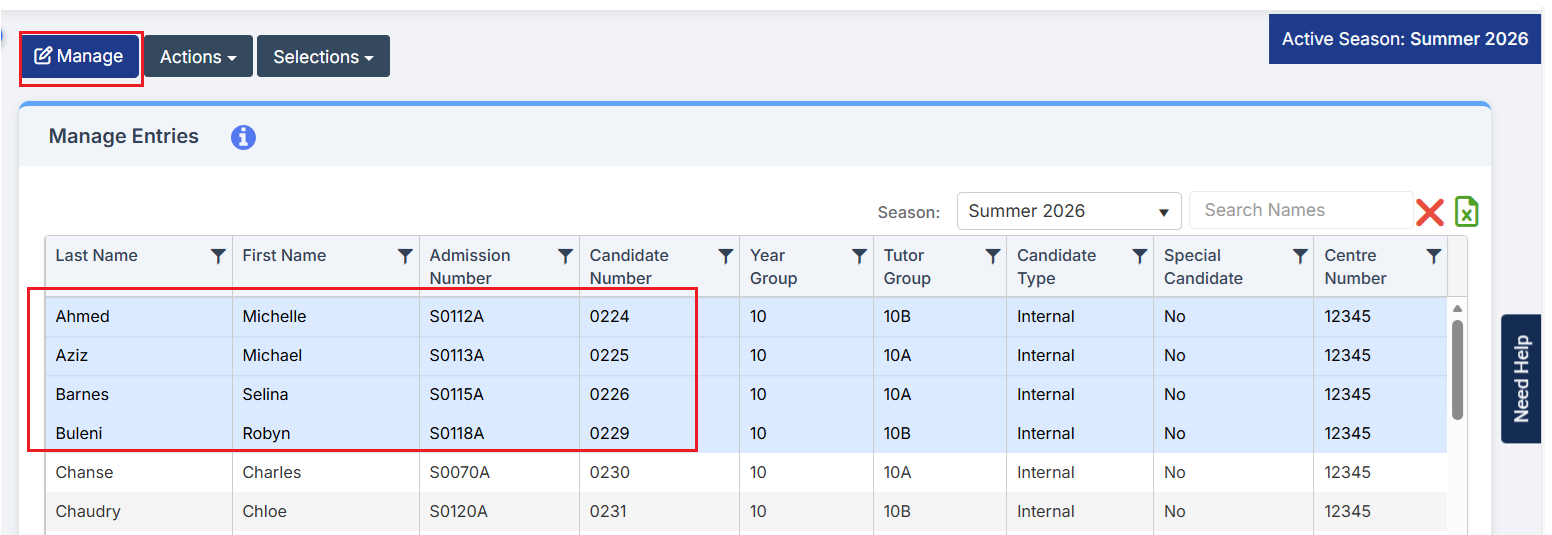 Access: The minimum permissions required to access the Manage Entries page is found in the Examination Module of Config>Setup>Roles & Permissions.