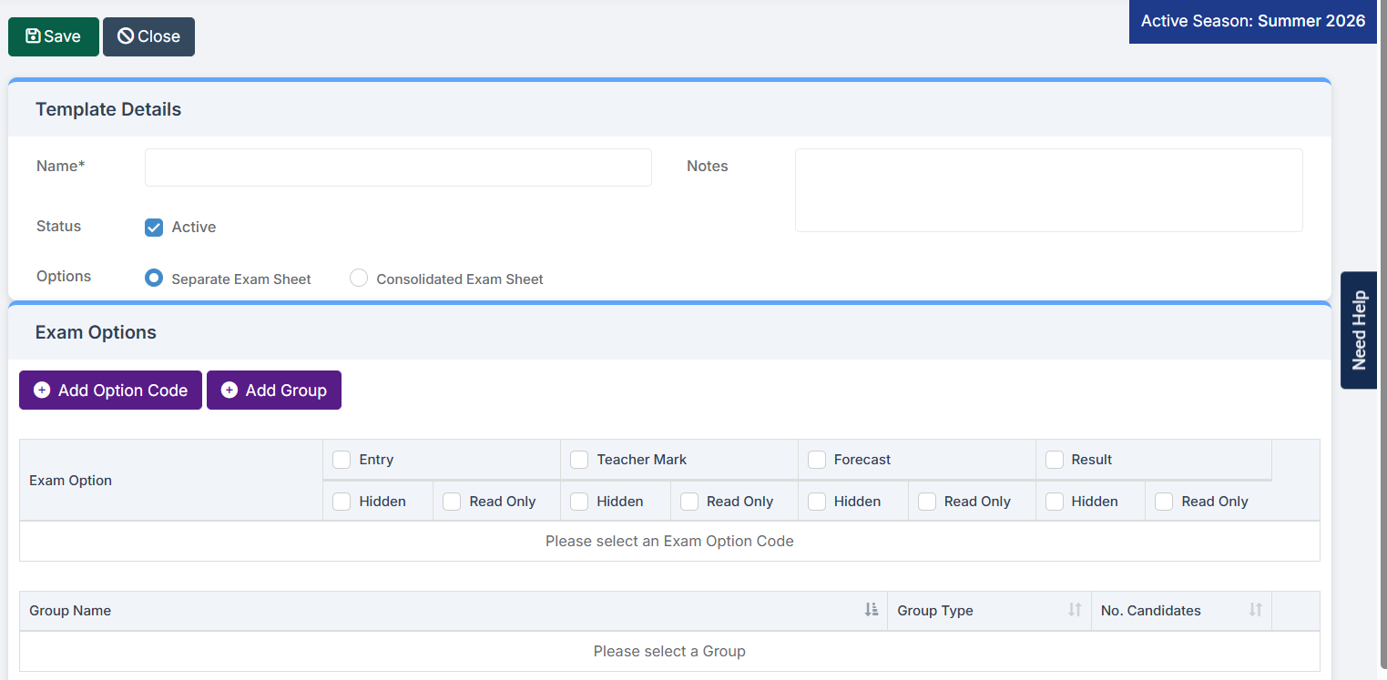 In the Template Details panel, enter a Name for the Exam Sheet, you can enter any Name but it is good practice to include the Exam Season so you can easily differentiate it from other Season’s Exam Sheets.