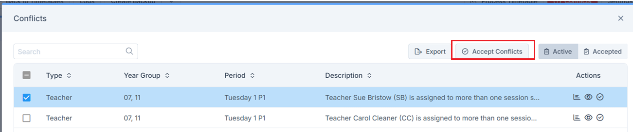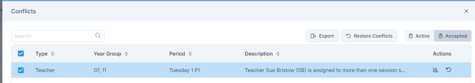 In the Accepted tab, Conflicts can be restored back to the Active tab in two ways, either tick the row(s) and click on Restore Conflicts or click on the Restore icon in the Actions column.