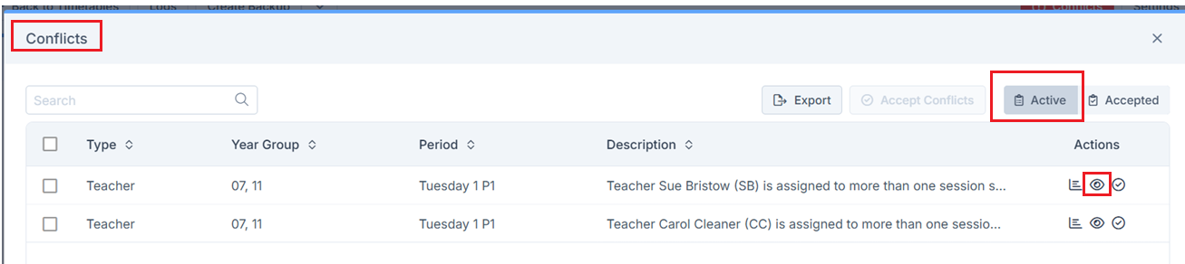 Click on View in the Actions column to view the conflict in the relevant page (Curriculum Plan or Scheduling).