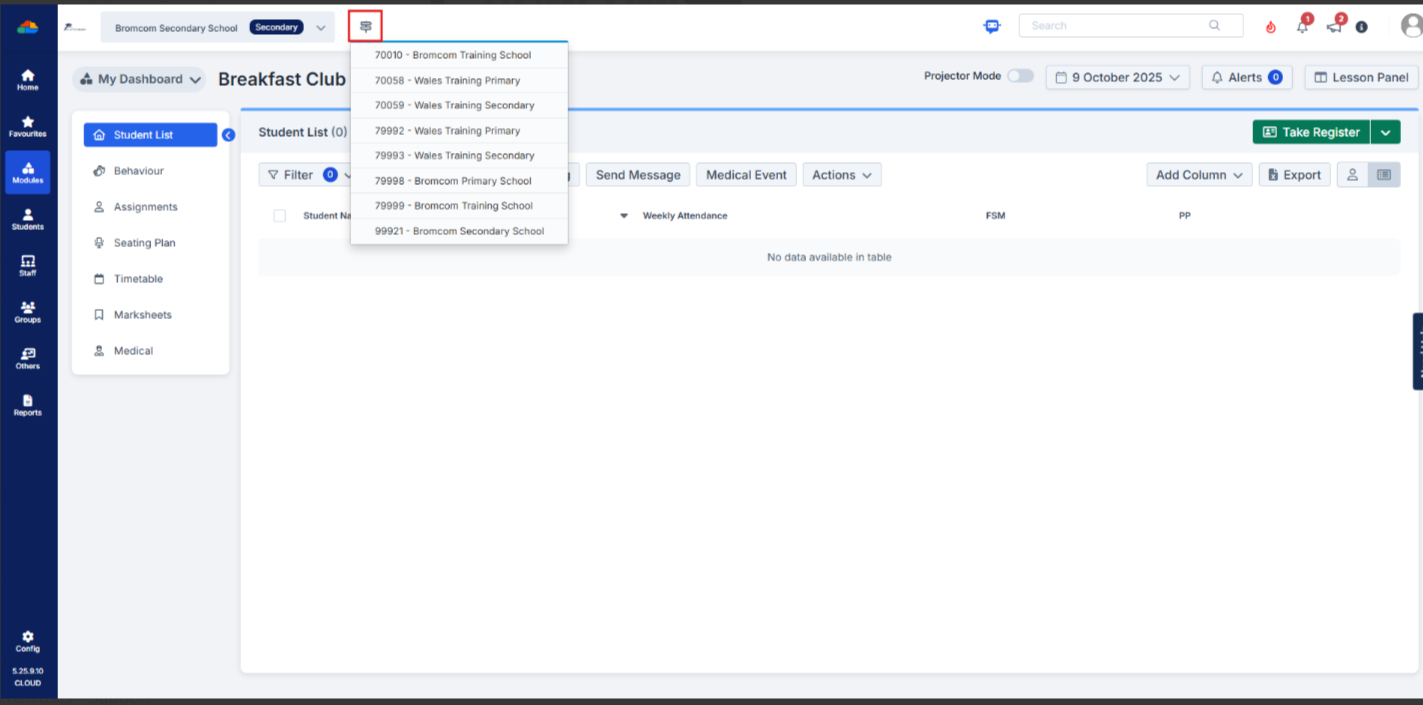 Once logged in if they want to change to another school click on the icon to the right of the School name and choose the required school