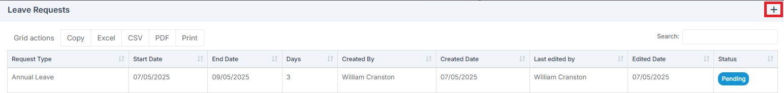 To Request Leave click on the + icon top right to open the Add/Edit Leave Request pop-up, enter the details and click the Save button.