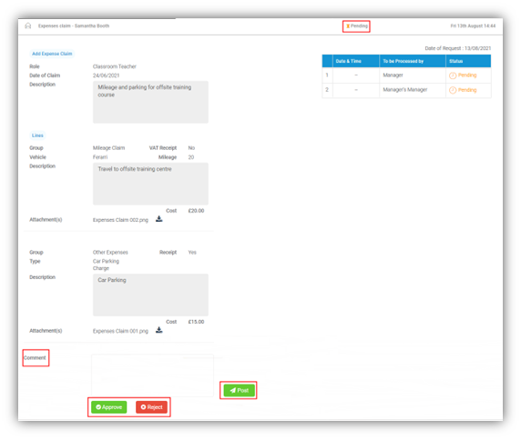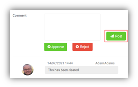 Additional Messages can be added by typing in the Comment box and clicking the Post button, these will be visible to all those Approving and the Requester and will display under the Approve and Reject buttons.