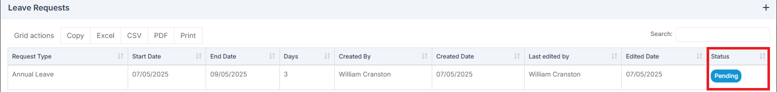 The Request will now show as Pending under the Status column. A Pending Request (that is not a past Date) can be edited by double clicking on the row.