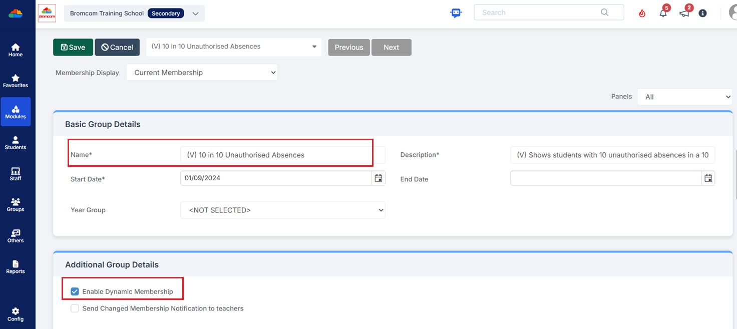 The report page shows that Dynamic Membership has been enabled and the reporting group membership will updated automatically overnight.