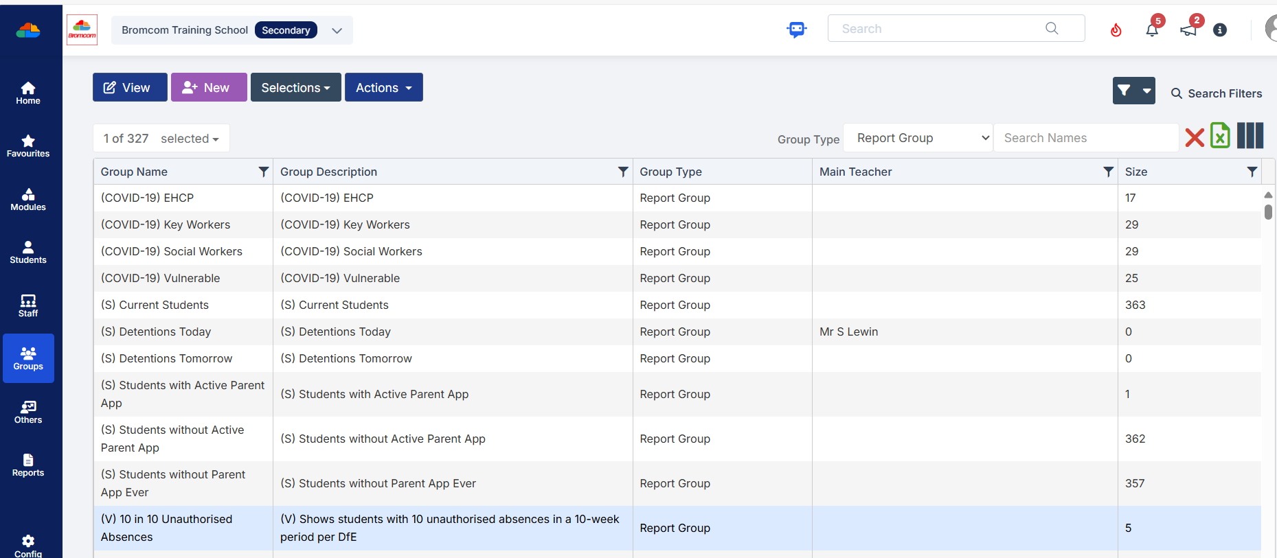 (S) are System generated Groups. These are groups created by Bromcom and are updated overnight.