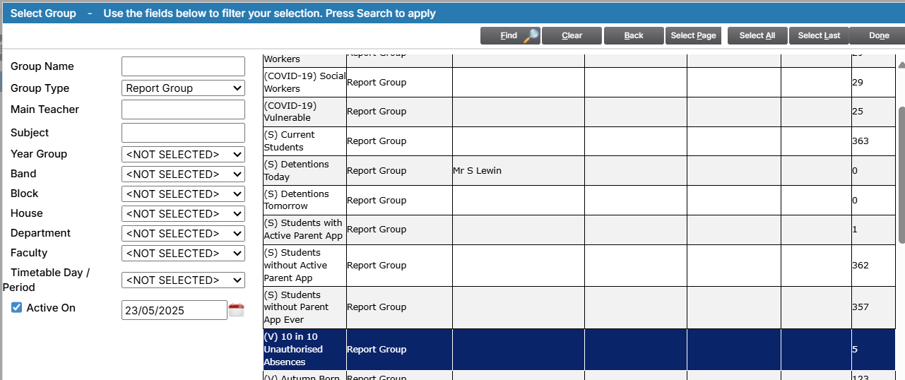 Reports > Attendance Users can now select the “(V) 10 in 10 Unauthorised Absences” report when searching by Class and selecting Group Type = Report Group.