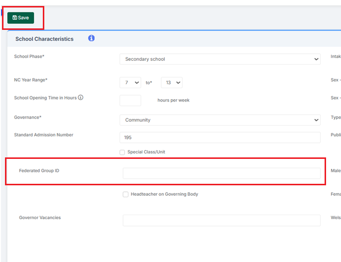 Use the drop downs and data entry fields in the School Characteristics panel to check/update the Federated Group ID is correct for your school.