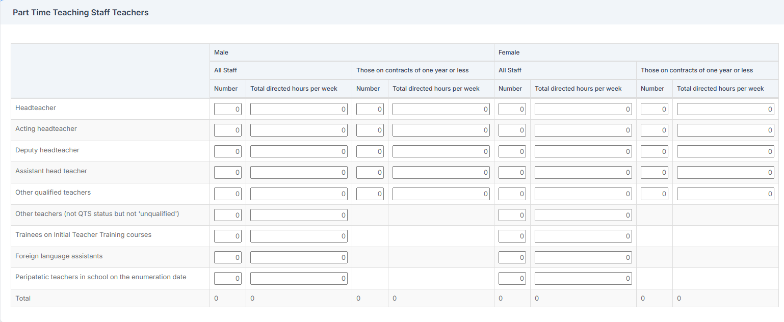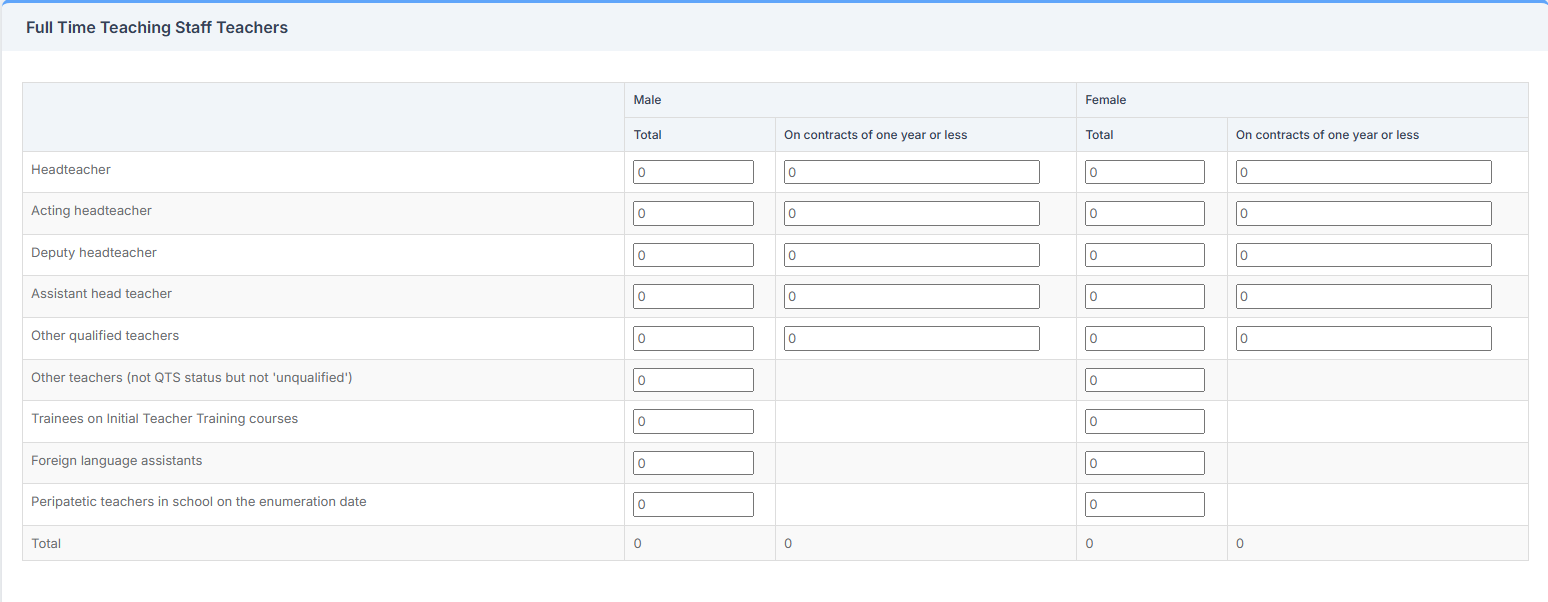 For the categories of Headteacher, Acting Headteacher, Deputy Headteacher, Assistant Headteacher, and Other Qualified Teachers, the number of staff on contracts of one year or less must also be recorded.
