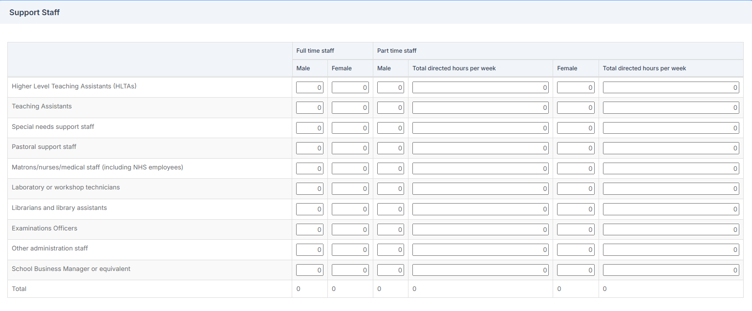Enter the total number of Support Staff in each category.