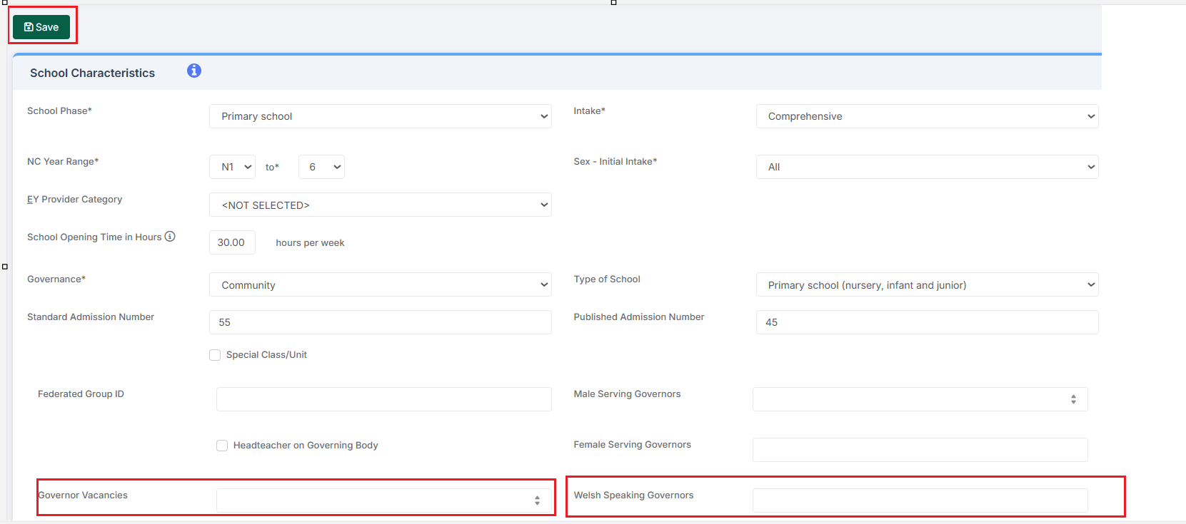 Error 11232 check Welsh Speaking Governors is correct. Use the up and down arrows to define the numbers.