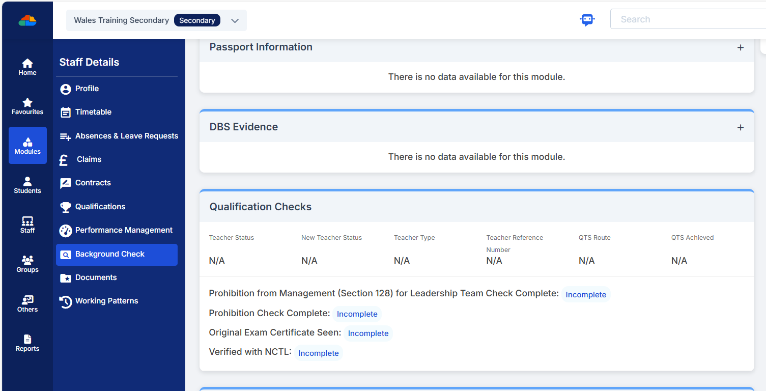 - For Bromcom guidance on the Staff Profile>Qualification checks see here.