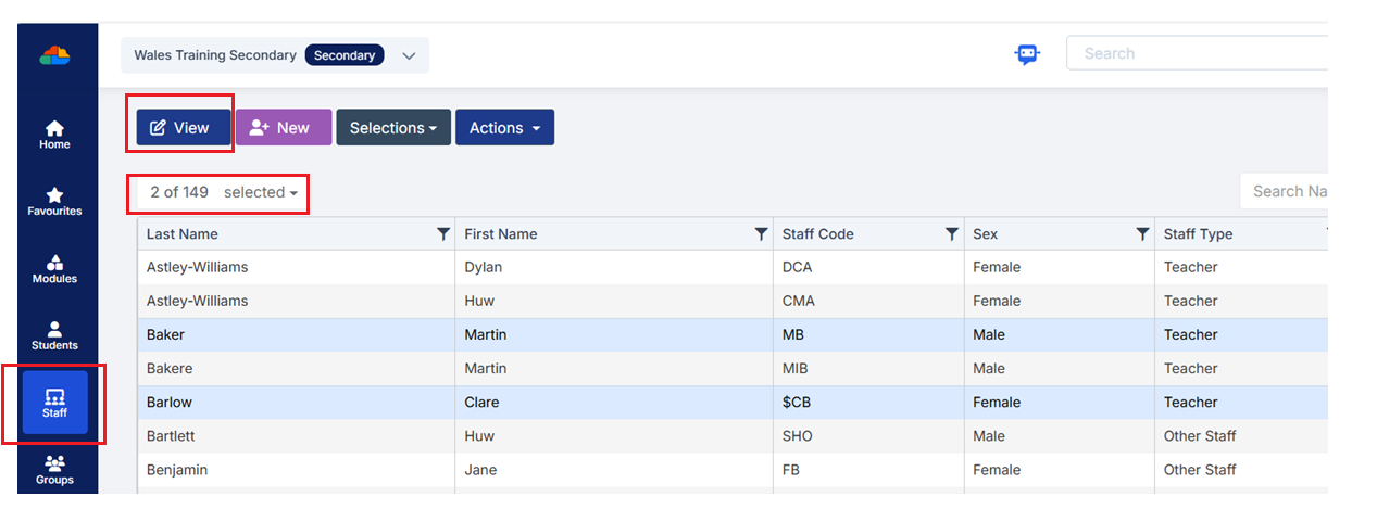 Go to Staff>click to select the required Staff member(s) then click View, this will open the Staff Profile