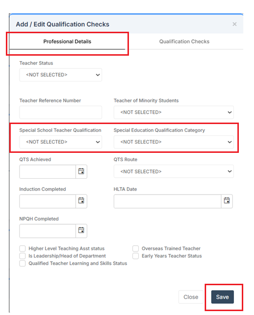 - Teacher qualification type must be present in the category details for special school teacher qualifications